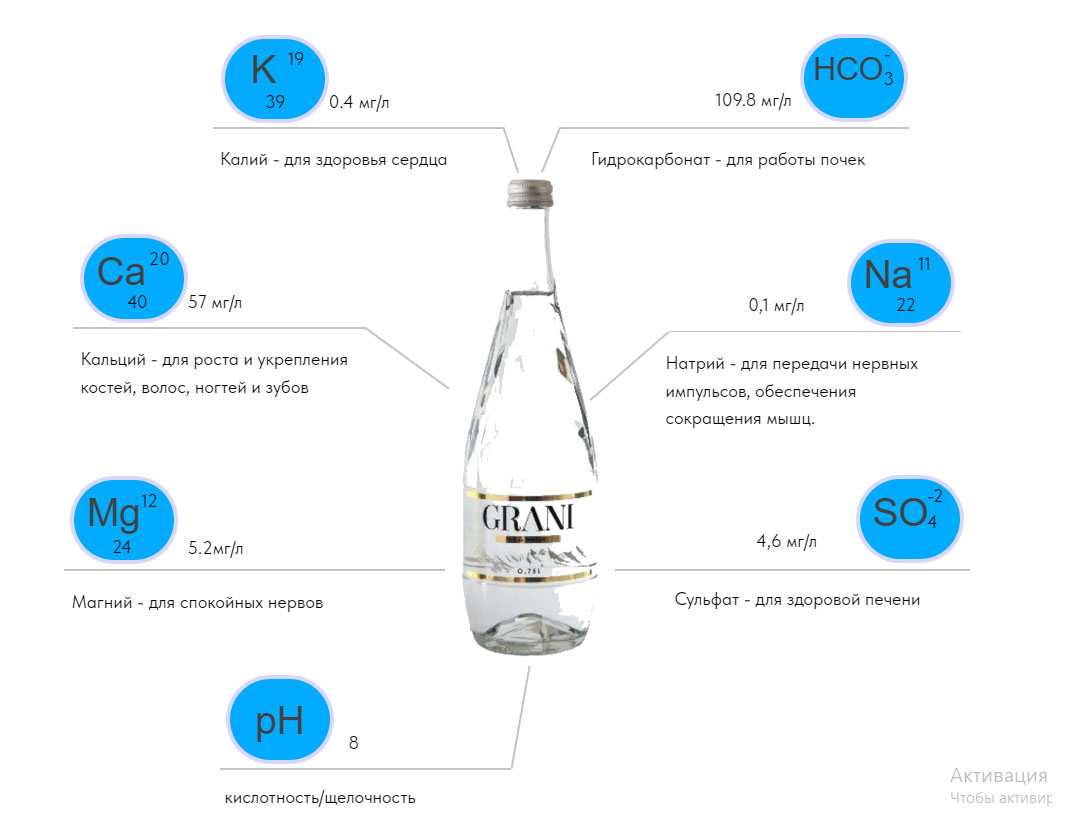 Вода GRANI характеризуется небольшой жесткостью, низким содержанием минералов, гидрокарбонатов, ионов железа и кремнекислот. Этим во многом объясняется элегантный, мягкий вкус напитков. Они прекрасно утоляет жажду и рекомендуется к употреблению в течение всего дня.